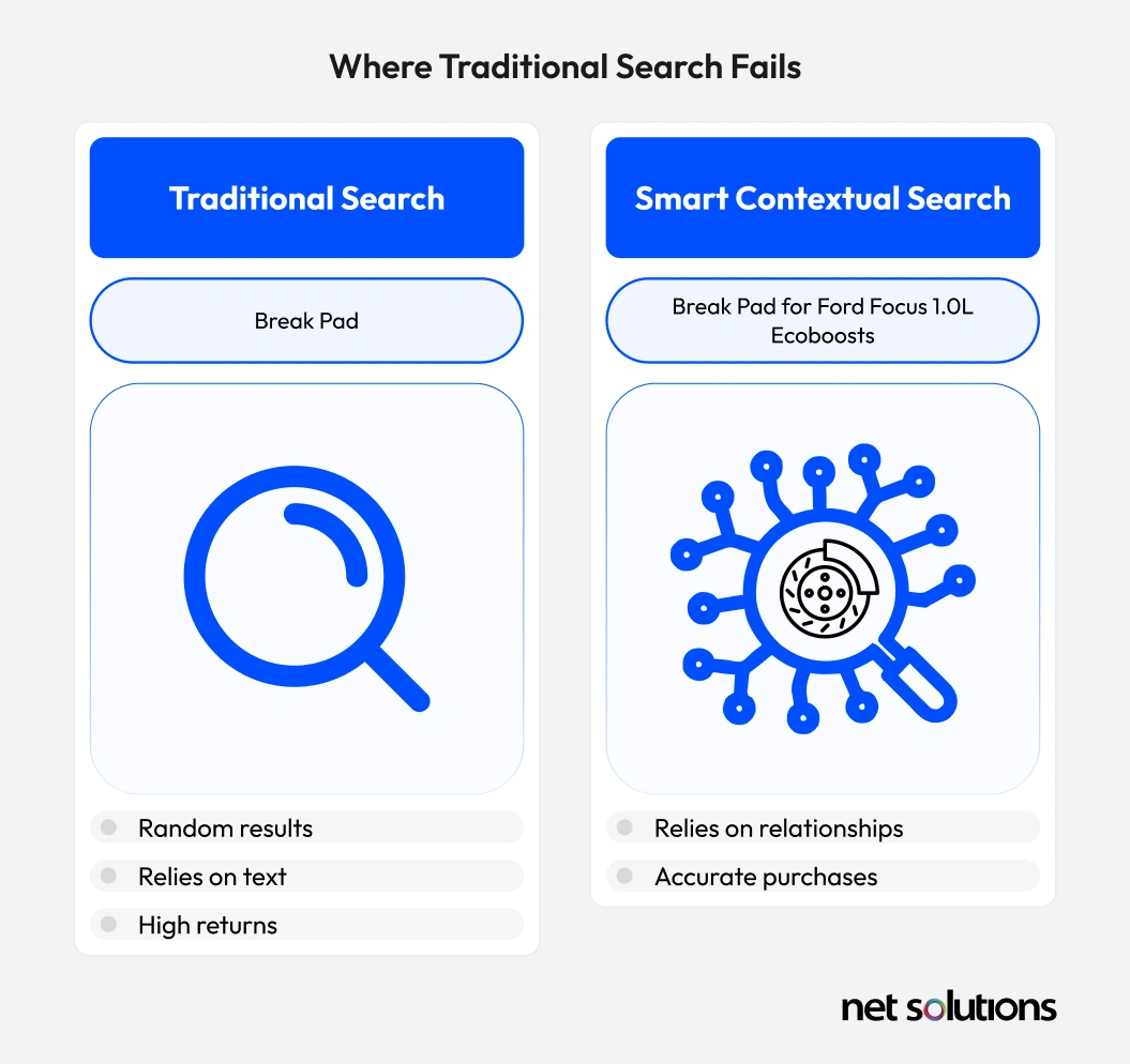 In these industries, a “usual search” experience, like those for groceries or clothing, falls short. Traditional eCommerce search engines are excellent at finding items by keyword (“red dress”) or filtering by simple attributes (“size large”). But they fundamentally struggle with: